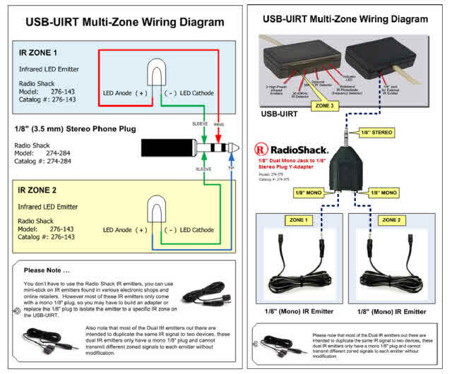 The 1/8" (stereo) jack on the back of the UIRT allows remote IR transmitters to be attached. For Zone-2 use, wire a stereo plug Tip(+) and Shield(-) {Left Channel} to your remote IR sender, and Ring(+) and Shield(-) for Zone-1 {Right Channel}. Alternatively use a stereo to mono splitter.
