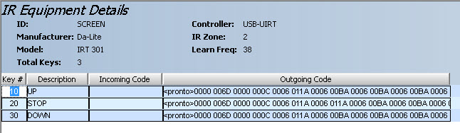 In the IR Details screen, the "Outgoing Code" field is where the actual IR command to be sent is stored.
