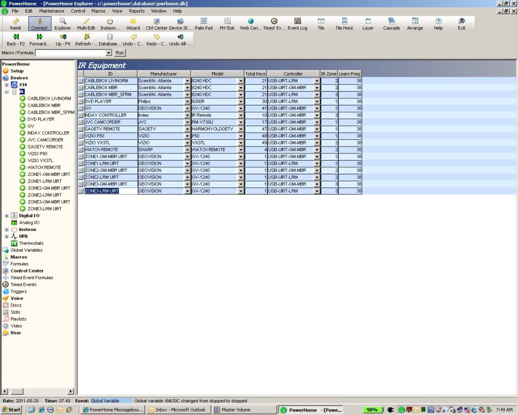 Concerning the problems you're having with the Somfy IR controller...it would not be unusual to encounter difficult remotes. The USB-UIRT is a great little IR controller but with the wide array of techniques to actually send IR codes, certain frequencies and coding formats may be difficult to read. What I suspect is happening with the Somfy is that it sends a "wakeup" burst followed by the actual control code that may be confusing the USB-UIRT. The LRNHELPER app is the USB-UIRT supplied learning tool and if its having problems, then its most likely just going to be difficult for the USB-UIRT to directly learn these codes. In the "IR Equipment" screen, you may try playing with the "Learn Freq" field to see if a different learn frequency may improve recognition. Most IR codes (in the US) default to around 38 KHZ which is the default value. But some IR remotes may be at the higher 56 KHZ (the USB-UIRT is optionally available with this frequency IR learner) and this could possibly be a problem. The USB-UIRT wouldnt have a problem sending this frequency, but could have a problem receiving at this frequency. And like you, Ive also found that there is variation in the distance of learning. Most of the time it needs to be pretty close but I have on occasion found a certain remote that must be learned at a greater distance. In the case of what I was explaining before, if the Somfy sends a burst, the USB-UIRT may be interpreting this as the "end" of the IR code but the burst wasnt "long" enough (usually you must have several binary transitions) so it just ends up timing out. I wouldnt be too concerned about not being to learn the codes as long as you have the ability to copy/paste from the internet. Its just a limitation of this particular controller.
