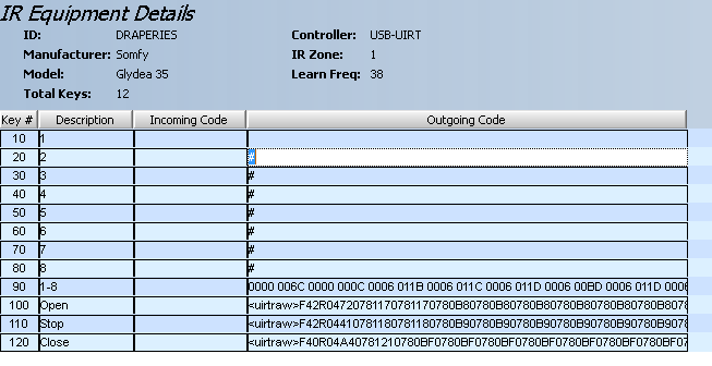 Line 90 is a code sequence from the Somfy remote captured by the UIRT Test Utility. Actually that utility refuses to capture the IR signal, but if I click on the "Accept Burst" button I seem to get a sequence. The sequence for the "1-8" button on the Somfy remote is what is placed in Line 90.