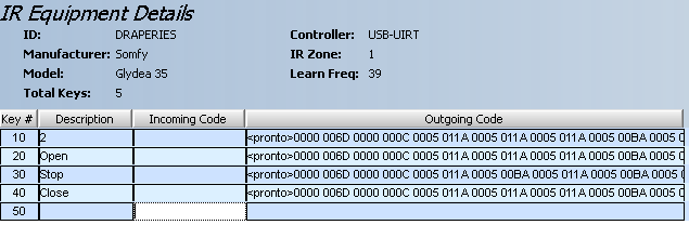 For my Somfy drapery control IR remote I am unable to EVER get past this error alert. No data is ever put in the Outgoing Code field of the IR Equipment Details form in PH.