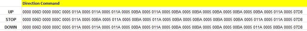 Lines 70-90 are good captures from my movie screen IR remote. Lines 100-120 are captures from my Somfy IR controller doing the same operations.